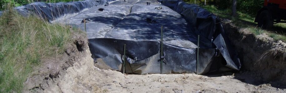 Within the existing sediment drying area, an excavator was used to create a dewatering and burial area that was 30 ft wide, 300 ft long and 3 ft deep. The area was sized to house five large dewatering bags but ultimately only four were needed to capture the dredged sediment. Excavated material was hauled to a construction site to use as fill material. The excavation was sized to house five sediment dewatering bags, but only four were necessary to accommodate the extracted volume of sediment. A layer of geosynthetic cloth was placed along the bottom of the excavation followed by a layer of gravel. The dewatering bags were laid out on top. The gravel stone maintained a porous volume though which water from the dewatering bags was able to drain. The water re-entered the pond through three fluming ditches (containing 12” DR17 HDPE pipes) in each bag.