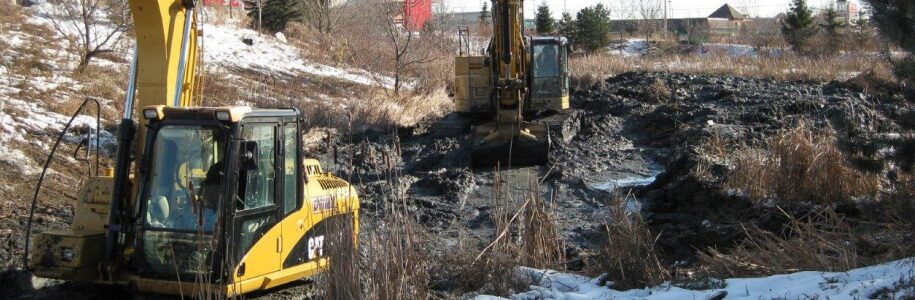 The dewatering process was completed when it was determined that the remaining water could not be pumped out. It was integrated with the sediment at the bottom of the pond. Two excavators, each with a capacity of 3 tonnes, were used to scoop out the muck (Figure 2). Due to continuously melting snow from the banks of the pond, the muck was very wet and introduced a challenge during the removal process. In general, to ensure that the clay liner is not damaged during the dredging process, a skilled and experienced worker needs to be designated to operate the machinery. This is essential to the functioning of the pond, as a clay liner retains a minimum pond volume and prevents contaminants from entering the soil and groundwater reservoirs.